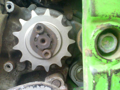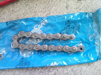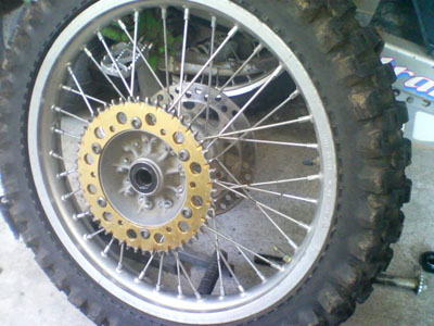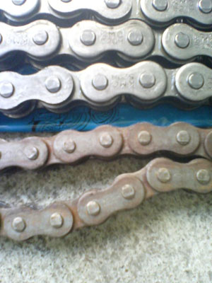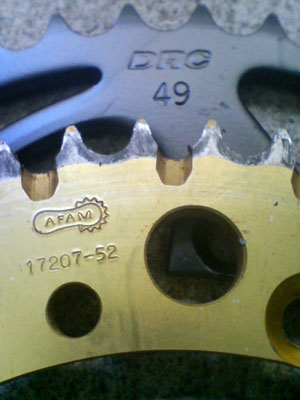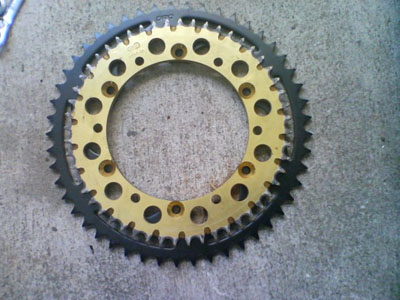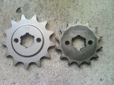 | チェーン・スプロケット(前後)の交換です。 という事で、リア周りを外します。 ![]() 下になっているリアスプロケット 大きくない? ![]() ただ交換では面白くないので サイズアップ・・・ ってそのままじゃん<つっこまないで 歯数が違うでしょ! ![]() 大きいのに歯数が少ないのは何故でしょう? お気づきの方は? 「はい、520にサイズアップです。」 428→520へのコンバートです。 組み込んだ画像が無いのはご愛嬌と言うことで(^^; 引き続きフロント側の交換前 ![]() 外して大きさを比べる こちらも520用が13丁 元の428用が14丁 ![]() ふた周りぐらい大きいです。 ![]() スイングアームの根元に当たりそうなくらい外周が大きいです。 12丁くらいが大きさ的に良いのかも カバーの内側にチェーン外れ防止のプレートが スプロケに当たり付けられませんでした。 カバーだけ着けたらプレートの厚み分が不足してて ネジを締めてもカバーがガタガタと動くし 短いネジに交換が必要だけど・・・ そのまま付けちゃいました。 当然、チェーンも交換しないとダメですから ![]() 428の感覚で130コマを買いました。 ![]() 長すぎました・・・・・(;;) ![]() 切りました。 数えたら112コマで十分です。 色々ありましたが40分くらいで作業終了です。 交換したら走りたくなるのが人情・・・・・・ってか!? こちらへどうぞ |
