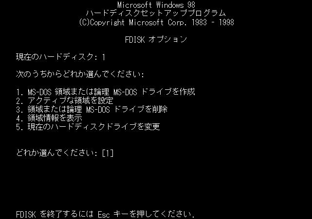 1.MS−DOSプロンプトから FDISKと入力しEnterキーを押す。