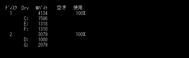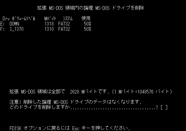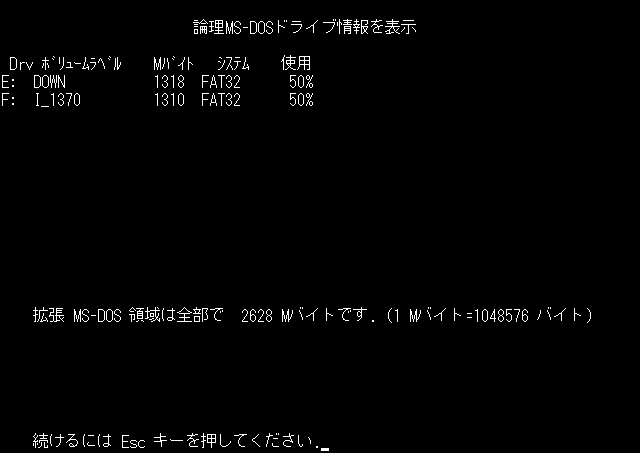 この場合、拡張 MS-DOS 領域がE:とF:の2つに分けられていることが判ります。