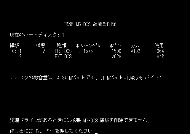 次に、拡張 MS-DOS 領域を削除し、