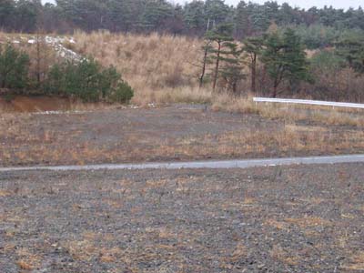 林道入り口(ガードレール切れたところの左側、松の木の間) |