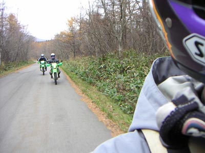 | 無事に通り抜けでき、白石スキー場からの下り道 S.Yさん走りながらの写真撮り ![]() |